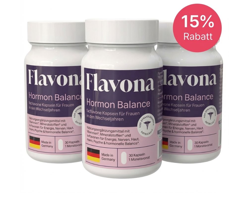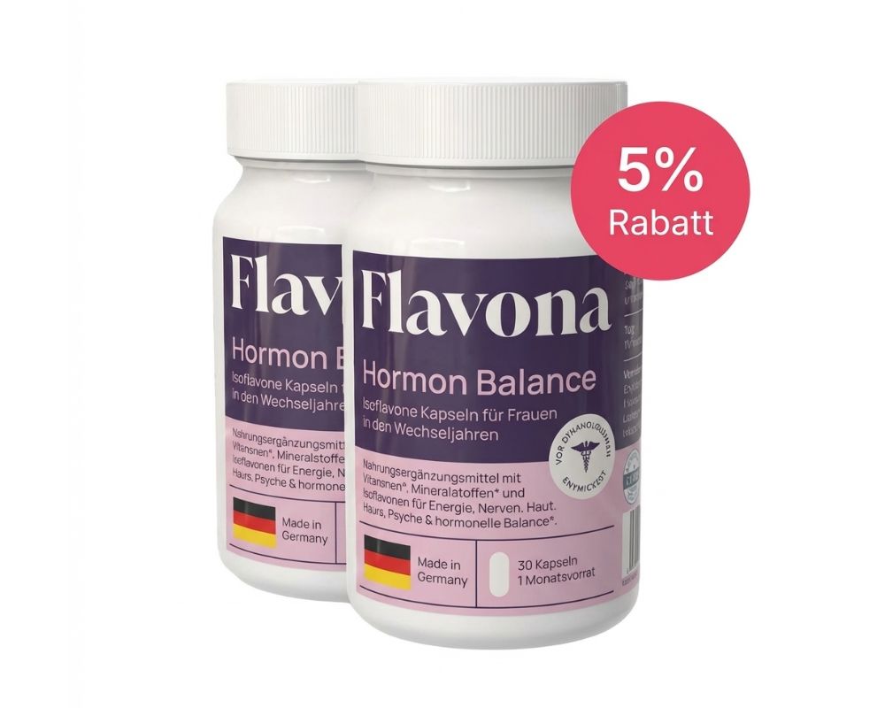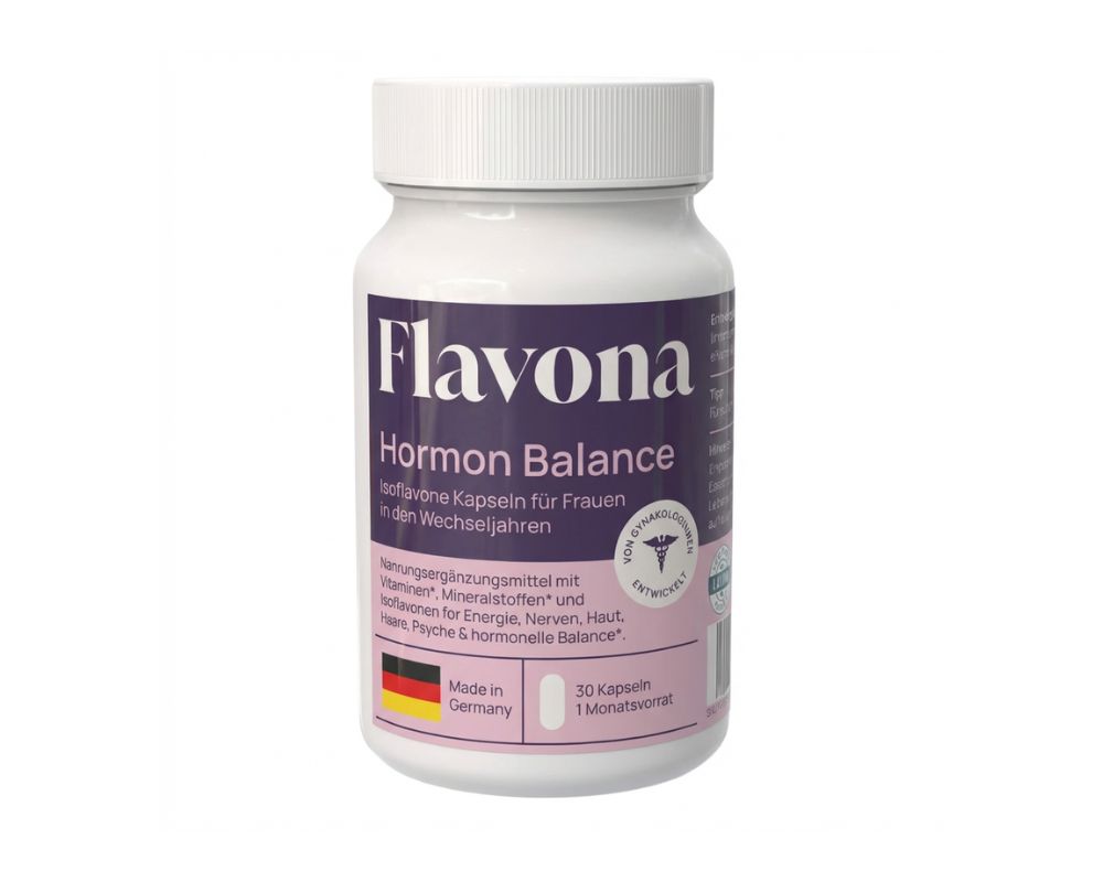 Flavona enthält keine Hormone. Die enthaltenen Isoflavone stammen aus pflanzlichem Rotklee-Extrakt und sind keine körpereigenen oder synthetischen Hormone. Das Produkt wird unter kontrollierten Bedingungen hergestellt und laborgeprüft. Bei bestehenden Erkrankungen oder Medikamenteneinnahme empfiehlt sich eine Rücksprache mit einer medizinischen Fachperson.